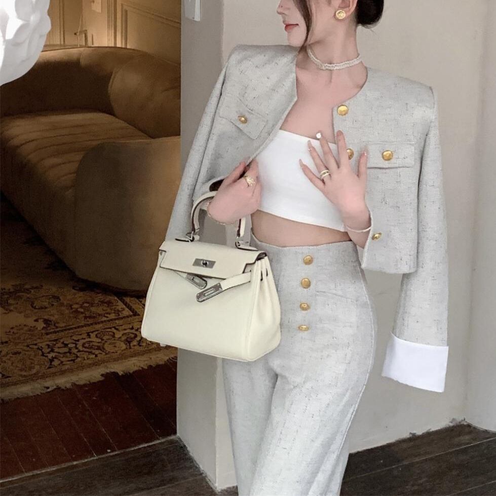トレンド感満載のパンツスーツセットアップが登場しました。クロップジャケットとワイドパンツの2点セットで、金色のボタンがアクセントになっています。シンプルでありながら、大人可愛い雰囲気が漂うセットアップは、ビジネスシーンからデートまで幅広く活躍します。