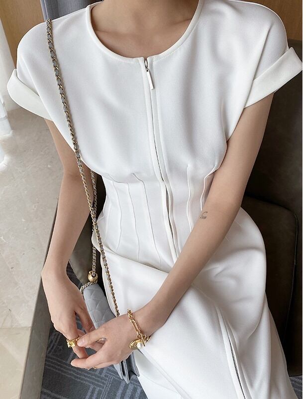 【送料無料】 ワンピース ミモレ丈 ラウンドネック オルチャン ジッパー 半袖 ウエストデザイン スリット ホワイト ブラック 白 黒 韓国 ワンピドレス レディース ミモレ丈 ミディアム丈 膝下 フレア ゆったり サイズ S M L XL 上品 おしゃれ 20代 30代 40代 存在感 こなれ感 キュート パーティー エレガント 抜け感 フェミニン ベーシック 高見え 春 夏 休日 イベント デート 食事会 着回し 普段使い モテ トレンド 流行 インスタ映え かっこいい 主役級