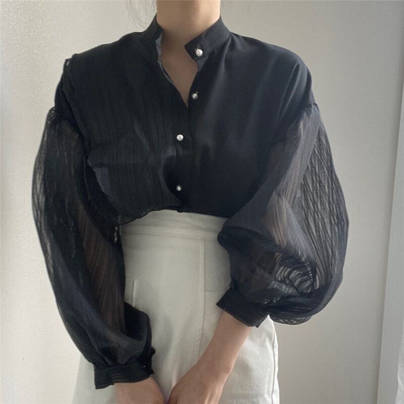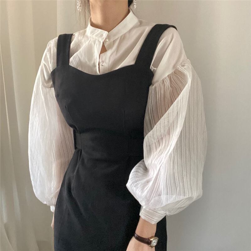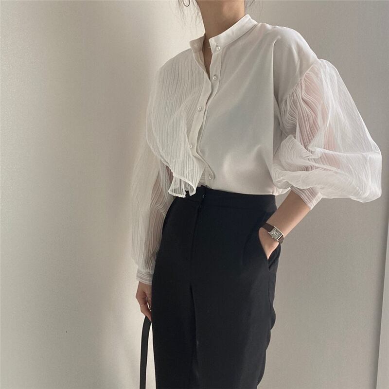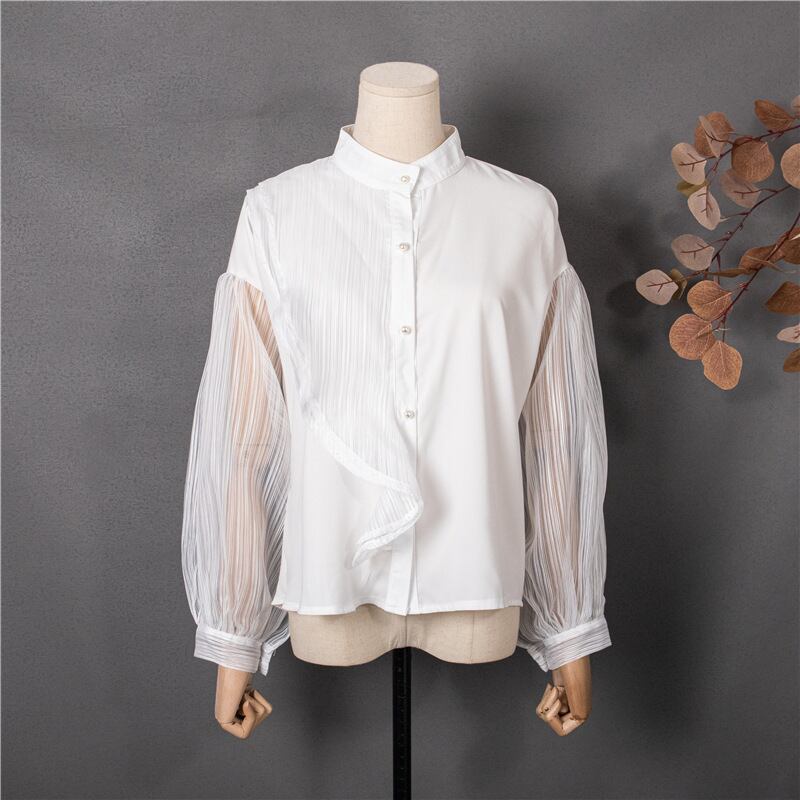 【送料無料】 アシンメトリーシャツ ドッキングブラウス フリルシャツ 白 ホワイト 黒 ブラック 韓国 レディース オルチャン 長袖 スタンドカラー オーバーサイズ 透け感 シースルー 薄手 かわいい 大人可愛い きれいめ 上品 おしゃれ かっこいい こなれ感 個性的 クール モード系 抜け感 フェミニン オトナ女子 大人女子 高見え 夏 休日 イベント リゾート 旅行 ショッピング 普段使い 重ね着 レイヤード 体型カバー トレンド 流行 インスタ映え フリーサイズ ゆったり