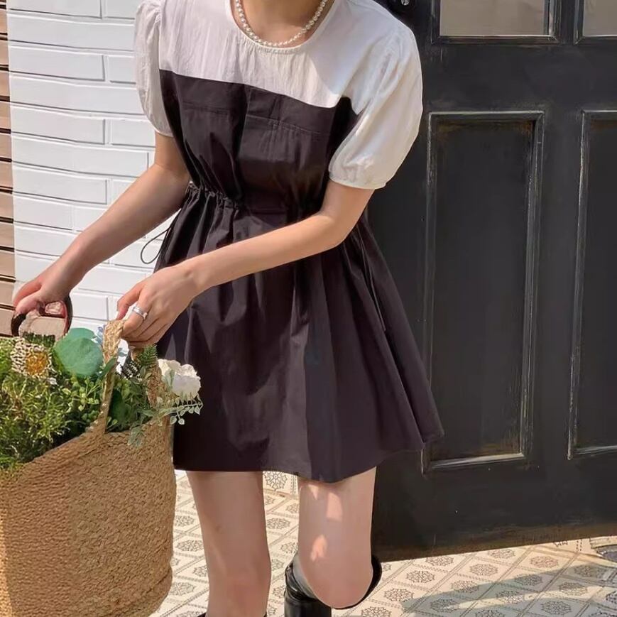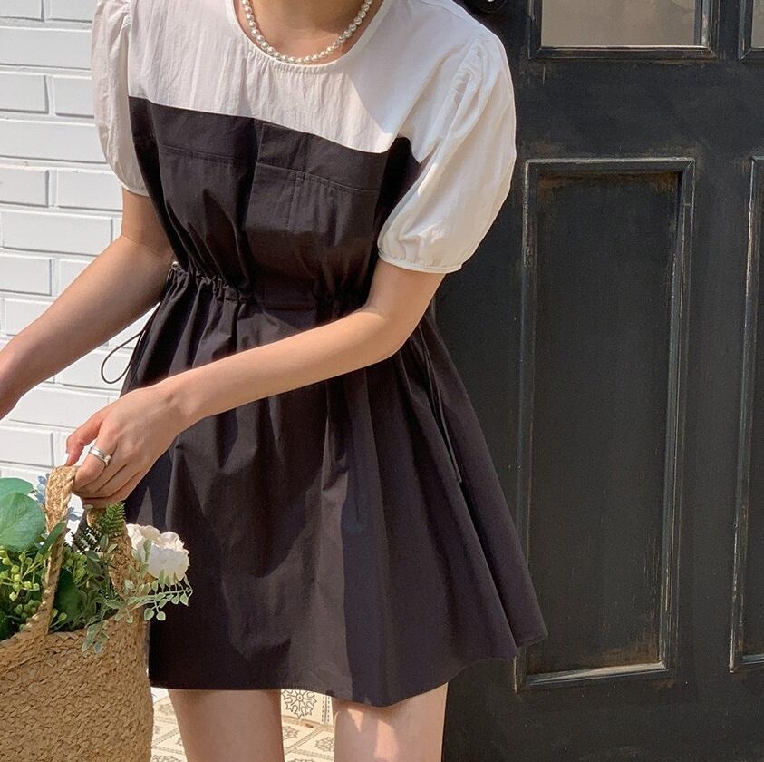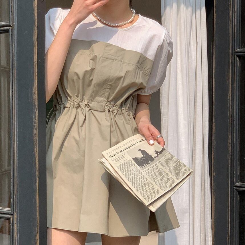 【送料無料】 ドッキングワンピース ミニワンピース 半袖 ドローストリングウエスト ベージュ 黒 ブラック 韓国 レディース オルチャン ショート丈 パフスリーブ ラウンドネック フレア Aライン ウエストマーク 切り替えデザイン ハイウエスト かわいい 大人可愛い シンプル カジュアル おしゃれ かっこいい こなれ感 ラフ ラブリー キュート 抜け感 無地 夏 休日 旅行 デート 着回し 普段使い 重ね着 レイヤード モテ 美脚 脚長 トレンド 流行 インスタ映え フリーサイズ