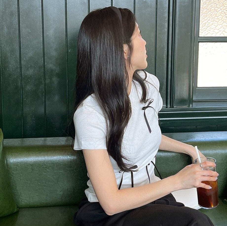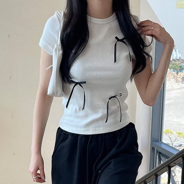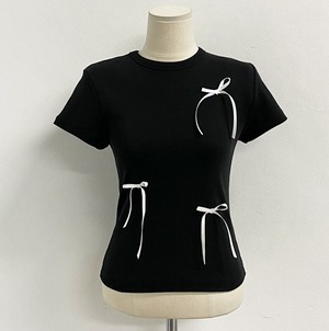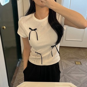 リボンがアクセントのモノトーンTシャツで夏のコーデをおしゃれに演出。