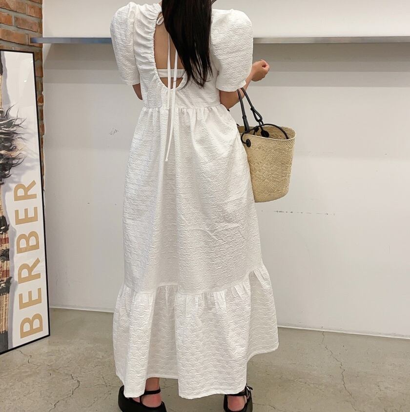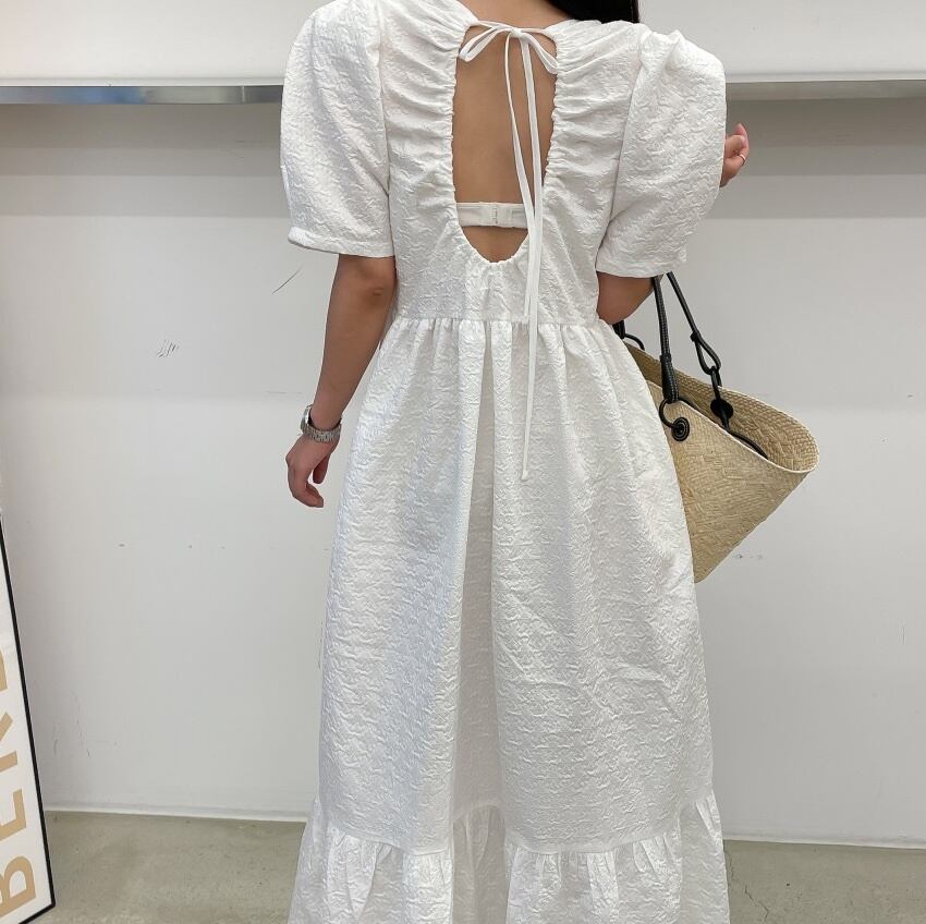 【送料無料】 バックカットオフワンピース 背中開きワンピース マキシ丈ワンピース パフスリーブ ボリューム袖 韓国 レディース オルチャン 白 ホワイト 黒 ブラック フレアワンピース ティアードワンピース 半袖 ぽわん袖 ラウンドネック フレア Aライン オーバーサイズ ウエストマーク バックリボン ハイウエスト ポケット ギャザー 薄手 かわいい 大人可愛い キュート 抜け感 フェミニン 型押し 夏 休日 イベント デート トレンド 流行 インスタ映え 清楚 フリーサイズ