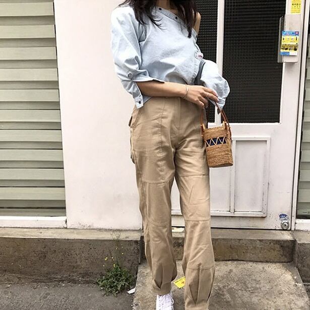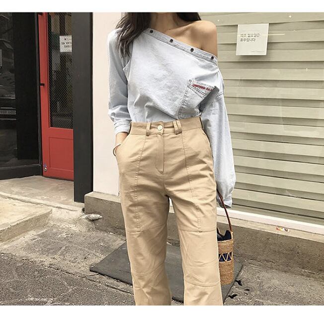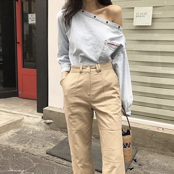 オフショルダーのデザインが女性らしさを引き立てつつ、ライトブルーのデニムカラーが爽やかな印象をプラス。ルーズなシルエットで着やすさも抜群です。