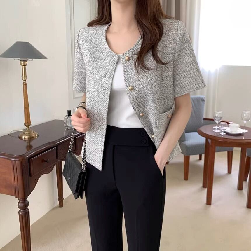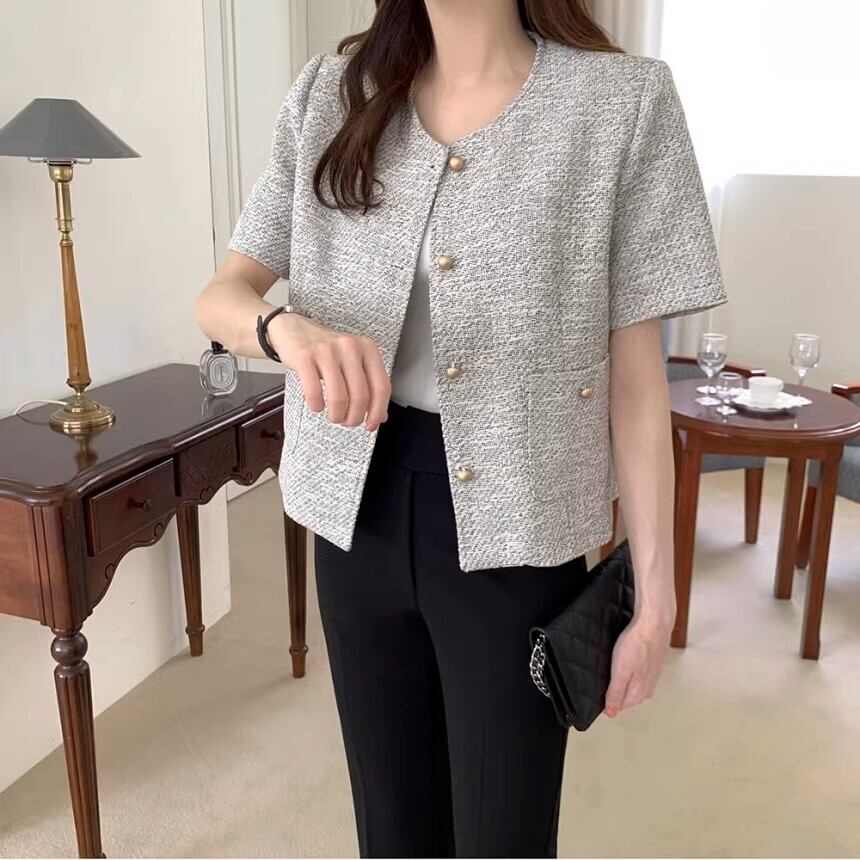 【送料無料】 ノーカラージャケット 半袖ジャケット ゴールドボタン 金ボタン グレー韓国 レディース オルチャン ショート丈 ラウンドネック ポケット コンサバ かわいい 大人可愛い きれいめ シンプル 上品 おしゃれ レトロ こなれ感 エレガント モダン フォーマル 抜け感 フェミニン ナチュラル ベーシック オトナ女子 大人女子 高見え 夏 ママ OL 休日 通勤 ビジネス ミーティング 食事会 普段使い 重ね着 レイヤード トレンド 流行 インスタ映え フリーサイズ