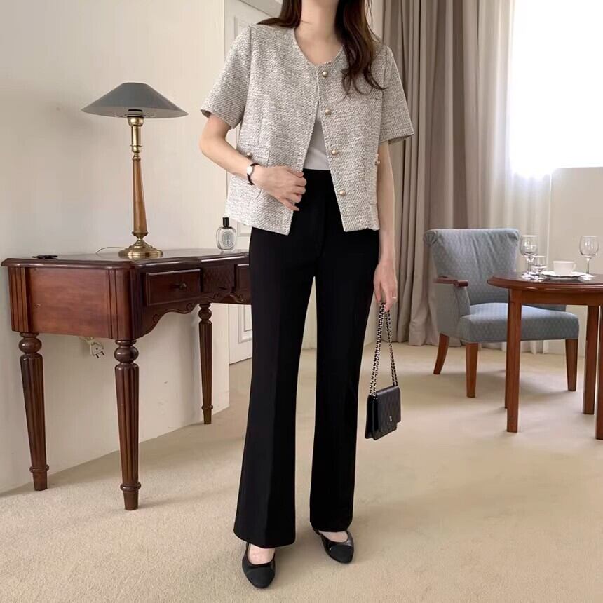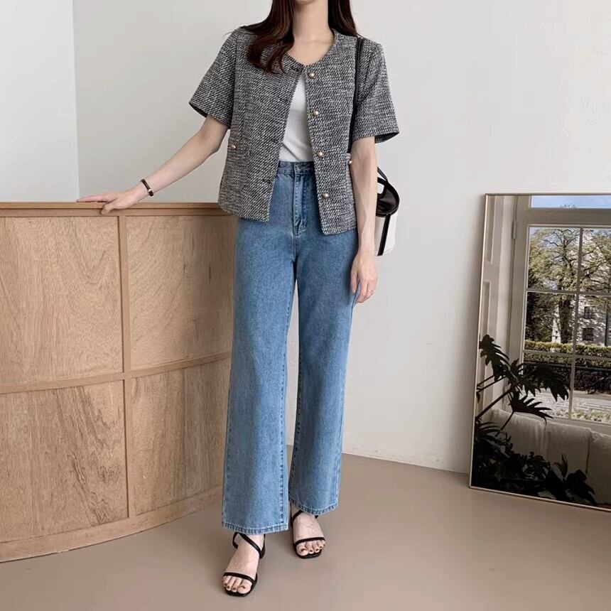 ゴールドボタンとグレーのショート丈で、シンプルながら上品さが光ります。