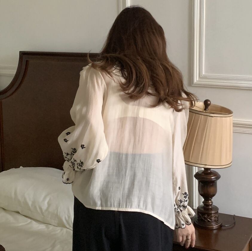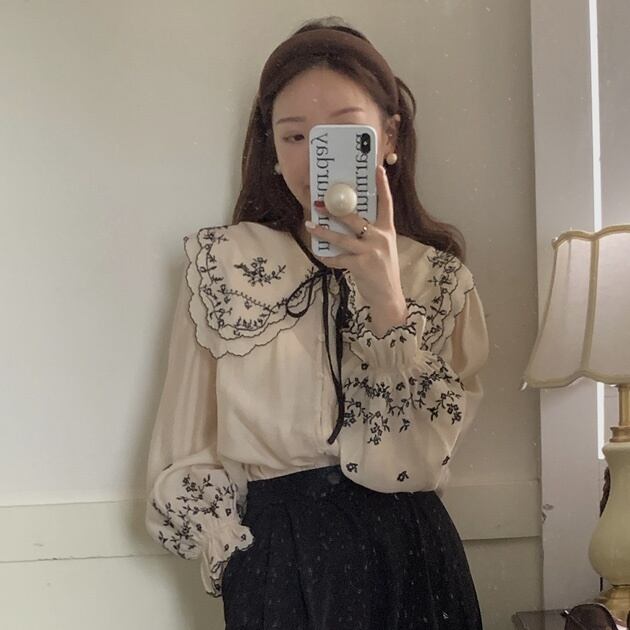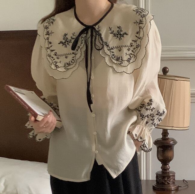 【送料無料】 刺繍長袖ブラウス ワイドカラー ビッグカラー 透け感 シースルー リボンタイ 韓国 レディース オルチャン クリーム 長袖 ボリューム袖 パフスリーブ フリル袖 Vネック 襟付き 角襟 フリカラー ダブルカラー パイピング かわいい 大人可愛い きれいめ 上品 おしゃれ レトロ こなれ感 キュート エレガント 抜け感 フェミニン ナチュラル ロマンティック 春 休日 ショッピング カフェ デート 普段使い 重ね着 レイヤード インスタ映え フリーサイズ
