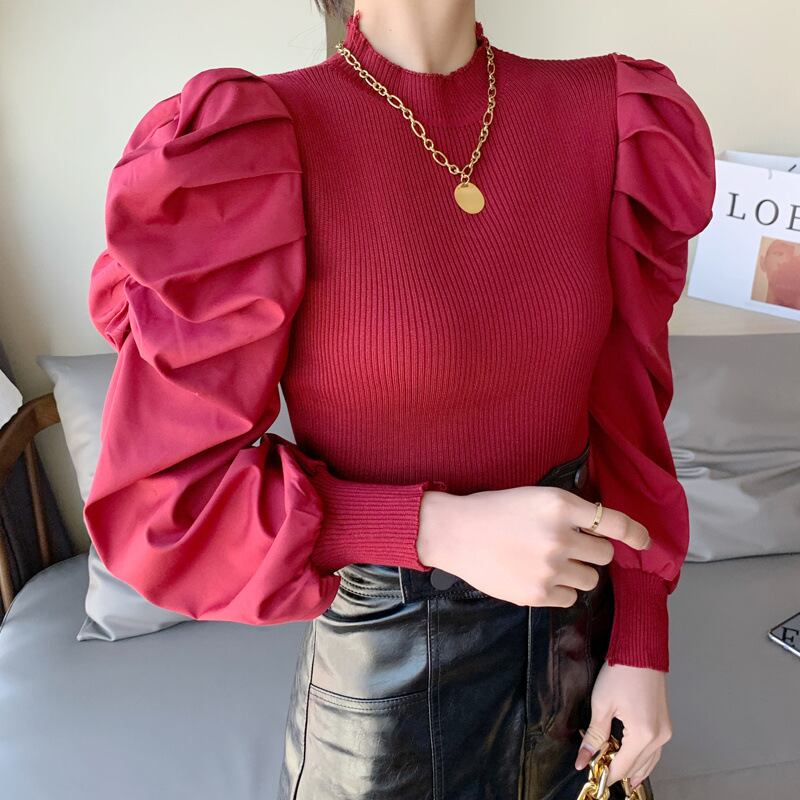 【送料無料】 パフスリーブ ボリューム袖 ボリュームデザイン ニット カラバリ 白 黒 赤 ピンク 韓国 レディース オルチャン トップス カットソー ニットソー 袖あり 長袖 ハイネック タートルネック スタンドカラー スリム タイト 細身 切り替えデザイン ドッキング ニット かわいい 大人可愛い きれいめ 大人 上品 おしゃれ お洒落 大人女子 こなれ感 キュート 主役級 存在感 抜け感 無地 秋 冬 10代 20代 30代 通学 デート 女子会 休日 旅行 着回し 普段使い