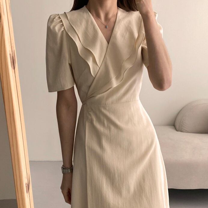 華やかなダブルカラーとパフスリーブが特徴のカシュクールワンピース。