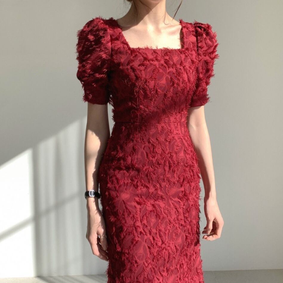 【送料無料】 背中見せ半袖ワンピース ミモレ丈ワンピース タイト 細身 赤 レッド 黒 ブラック 白 ホワイト 韓国 レディース オルチャン ワンピドレス ロング丈 ボリューム袖 パフスリーブ セミフレア マーメイド ベルライン ウエストマーク ふわふわ ハイウエスト タッセル かわいい 大人可愛い きれいめ 上品 おしゃれ レトロ こなれ感 ラブリー キュート エレガント 抜け感 フェミニン ナチュラル 高見え 夏 休日 パーティー イベント デート インスタ映え S M L