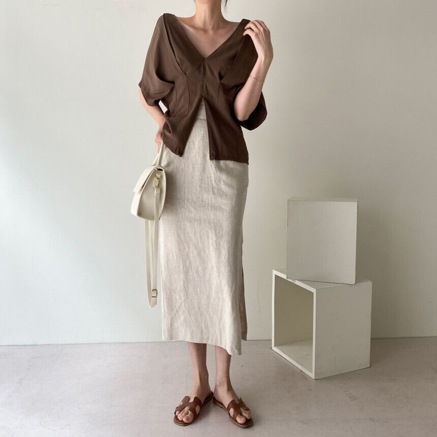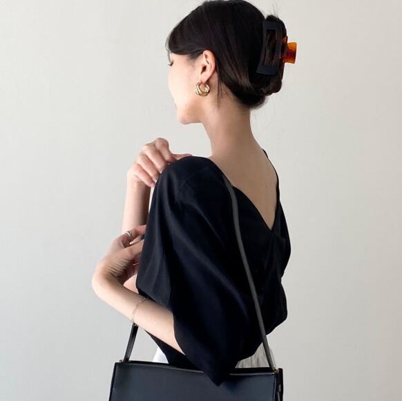 Vネック五分袖のオープンプルオーバーは背中見せデザインで大人可愛く。