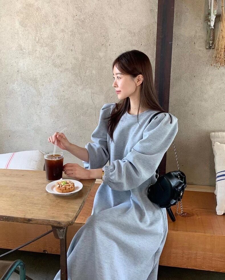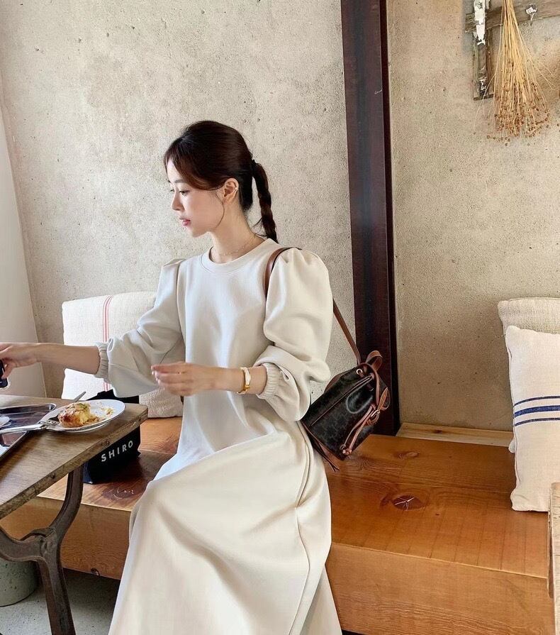 ボリューム感のあるパフスリーブとエレガントなフレアシルエットが魅力のスウェットワンピース。