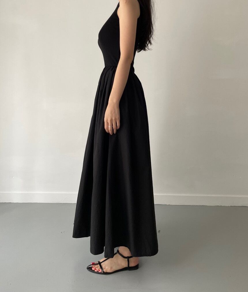 【送料無料】 切り替えデザインロングワンピース ワンピース ノースリーブ ラウンドネック Aライン プリーツ ロング丈 ハイウエスト スリム 細身 韓国 レディース オルチャン 可愛い 大人可愛い 大人女子 シンプル きれいめ カジュアル 大人 気品 上品 おしゃれ お洒落 こなれ感 抜け感 かっこいい きちんと 大人女子 シック クール モダン フェミニン ワンサイズ ブラック 夏 20代 30代 デート 女子会 お泊まり 普段使い コーデ トレンド 脚長 美脚 スタイルアップ