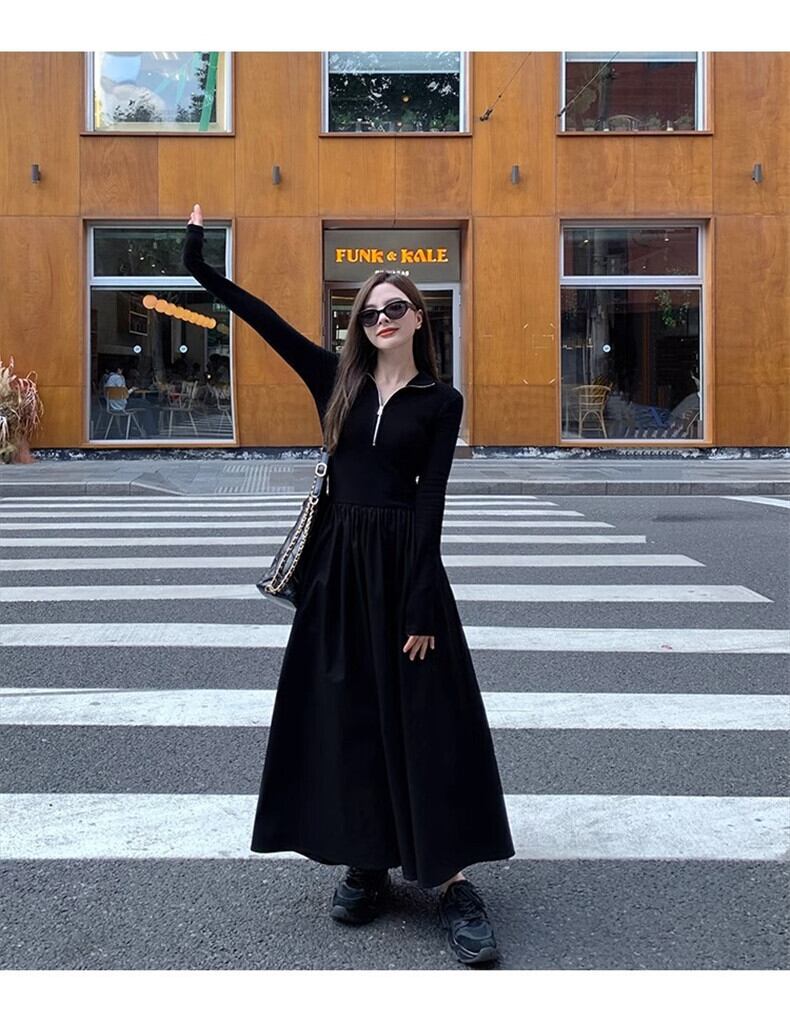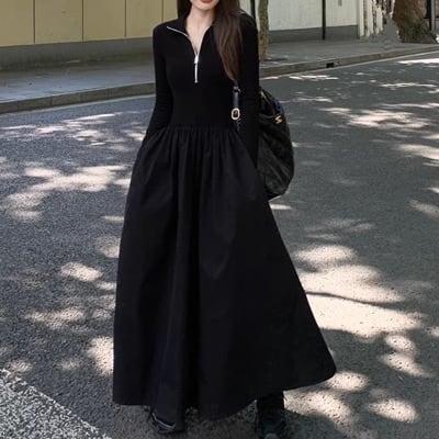 【送料無料】 ハーフジップフレアスカートドッキングワンピ ワンピース マキシ丈 長袖 フレア 2XL 3XL 韓国 レディース オルチャン 可愛い シンプル 個性的 大人 かっこいい きれいめ 高級感 高見え おしゃれ お洒落 モテ 女っぽい 大人っぽい 上品 美人 オトナ女子 大人女子 インスタ映え クール スタイルアップ デート 大人可愛い お出掛け こなれ感 カジュアル 20代 30代 40代 50代 女子会 トレンド 普段使い デイリー イベント パーティー 着回し 体型カバー ブラック