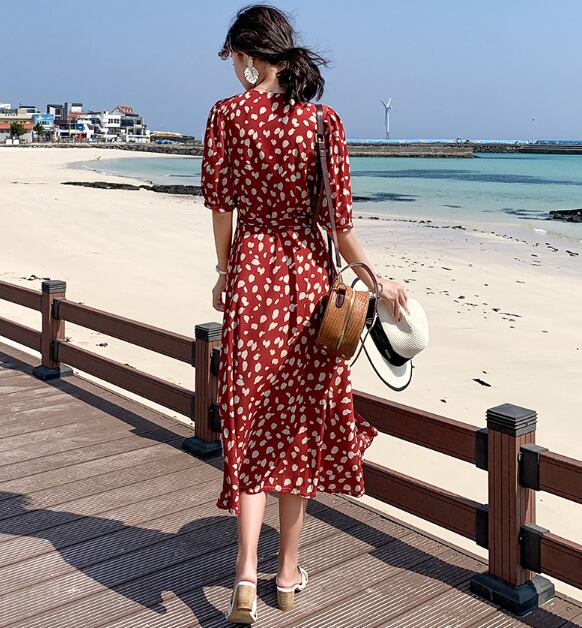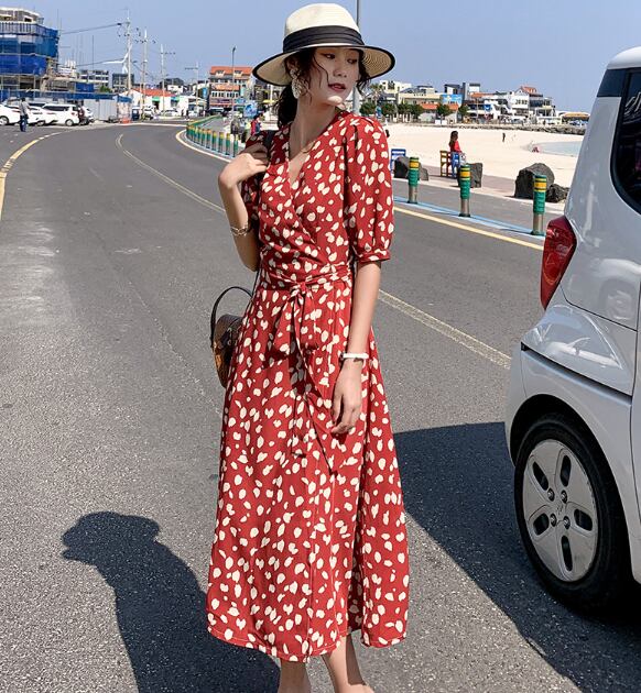 【送料無料】 Vネックロングスカートドレス ロングワンピス 半袖 パルスリーブ 総柄ワンピース 韓国 レディース オルチャン ハイウエスト 半袖 ウエストリボン Aラインスカート ふんわりスカート きれいめ カジュアル ビーチ リゾート 普段使い 大人可愛い 高見え かっこいい こなれ感 セクシー 20代 30代 40代 赤 エレガント 楽ちんコーデ 体型カバー 着痩せ スタイルアップ デート 大人女子 女子会 海 襟無し 夏 春 大人女子 お洒落 ママ 大人 オトナ可愛い 女性らしい