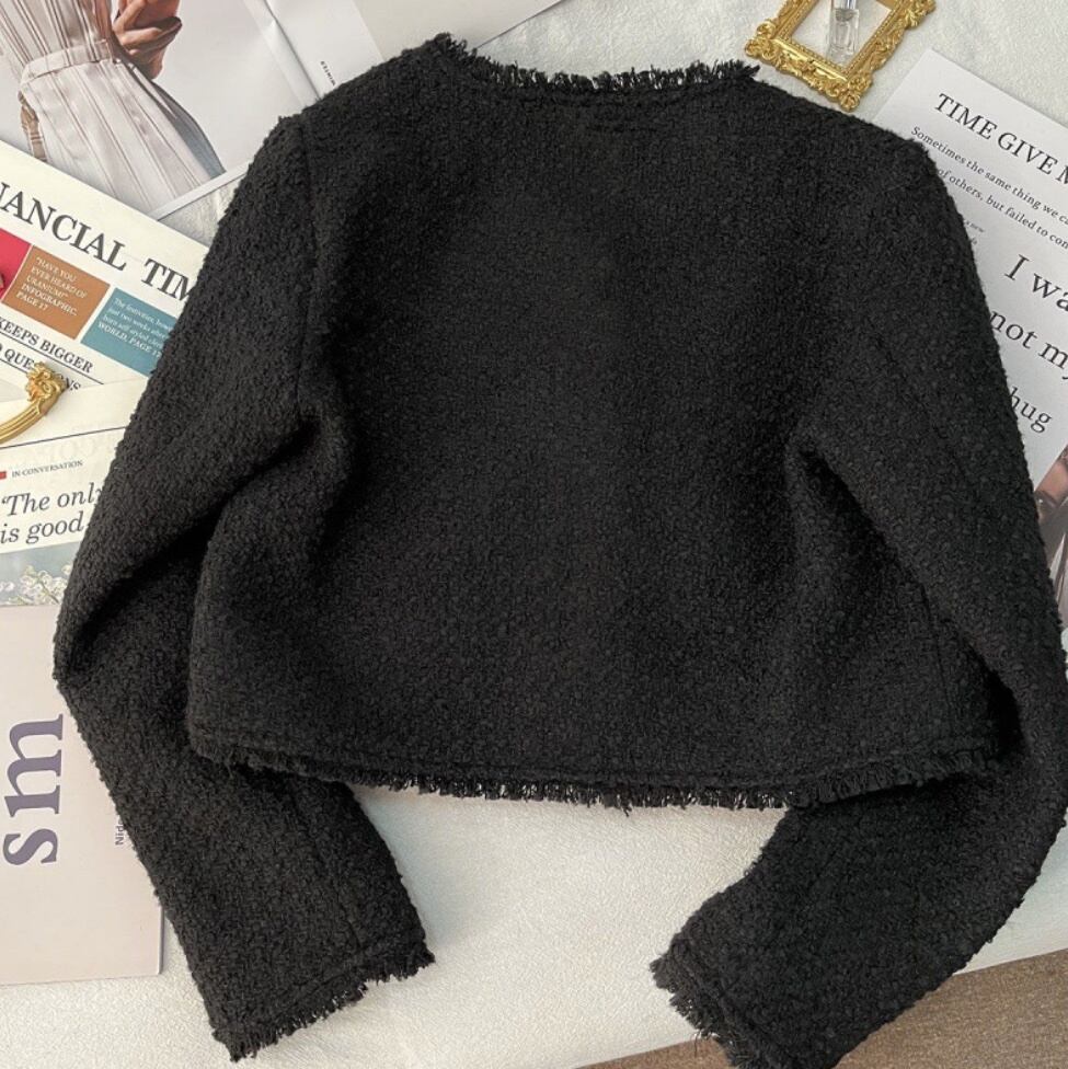 【送料無料】ショート丈ツイードジャケット ツイードジャケットブラック ツイードジャケット ツイード ジャケット 黒 ブラック ノーカラージャケット 高見えジャケット ノーカラー オルチャン 韓国 レディース フロントボタン 金ボタン ゴールドボタン フリンジ 長袖 きちんと 謝恩会 大人可愛い きれいめ 大人 上品 お洒落 おしゃれ オトナ女子 大人女子 こなれ感 入学式 入園式 卒業式 卒園式 セミフォーマル エレガント 食事会 フェミニン フォーマル ママ 母 高級感 高見え オフィス 主役級 存在感
