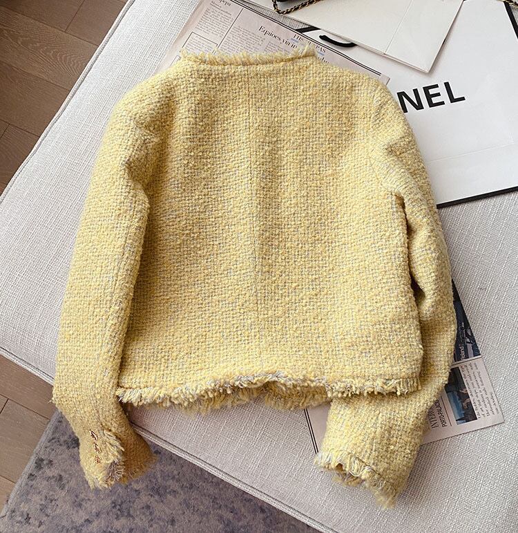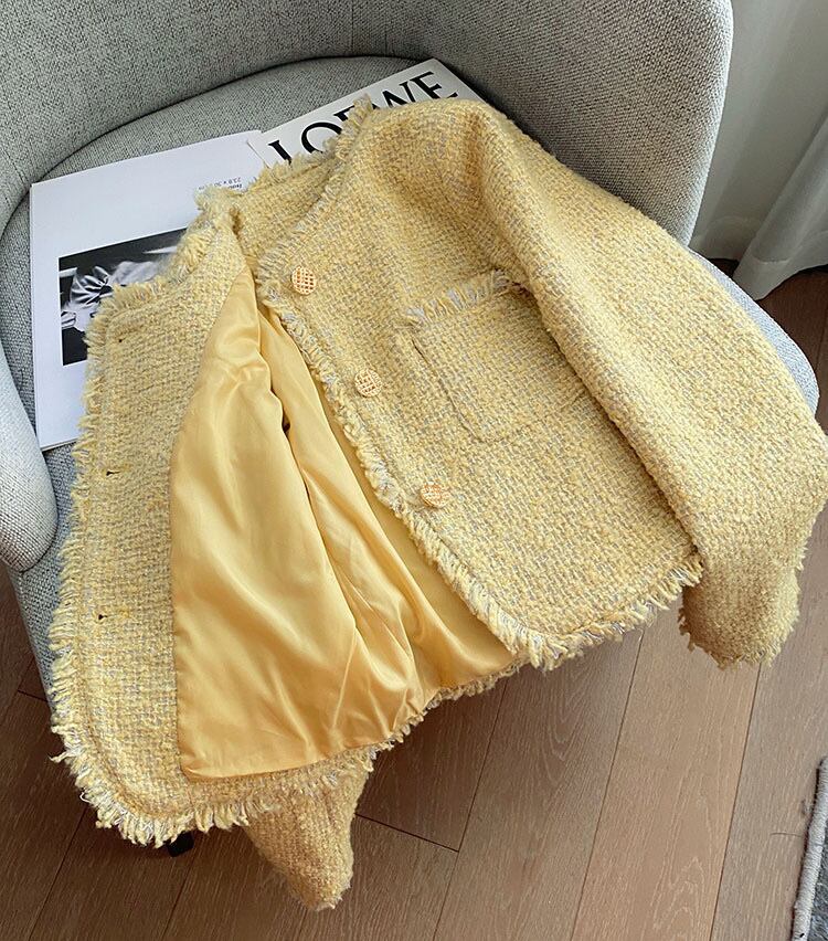 【送料無料】フリンジツイードジャケット ショートツイードジャケット ツイードジャケット ノーカラージャケット イエローツイードジャケット 高見えジャケット 黄色 イエロー ツイード ジャケット 韓国 オルチャン レディース シャーベットカラー フリンジ 結婚式 二次会 謝恩会 ショート丈 大人可愛い きれいめ きちんと 大人女子 オトナ女子 こなれ感 ゴールドボタン 金ボタン ゴールド 金 ボタン フェミニン エレガント お洒落 おしゃれ フォーマル セミフォーマル デート 重ね着 ママ 母 インスタ映え