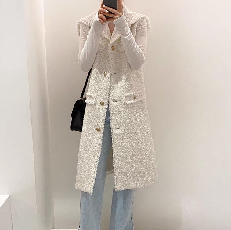 【送料無料】ノースリーブツイードロングコート 白 ホワイト クリーム アイボリー 韓国 オルチャン レディース ツイードコート ツイードロングジャケット ツイード 高見えコート 高見えアウター 高見え きれいめコート きちんとコート ノースリーブ かっこいい クール お洒落 おしゃれ オトナ女子 大人女子 上品 大人 こなれ感 抜け感 デート 高級感 重ね着 普段使い 着回し シンプル 大人可愛い 可愛い かわいい 個性的 フロントボタン