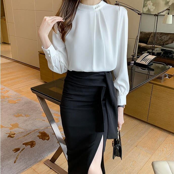 上質なサテンと軽やかなシフォン素材の絶妙なコンビネーションが、シンプルながらも華やかさを演出してくれるシャツです。