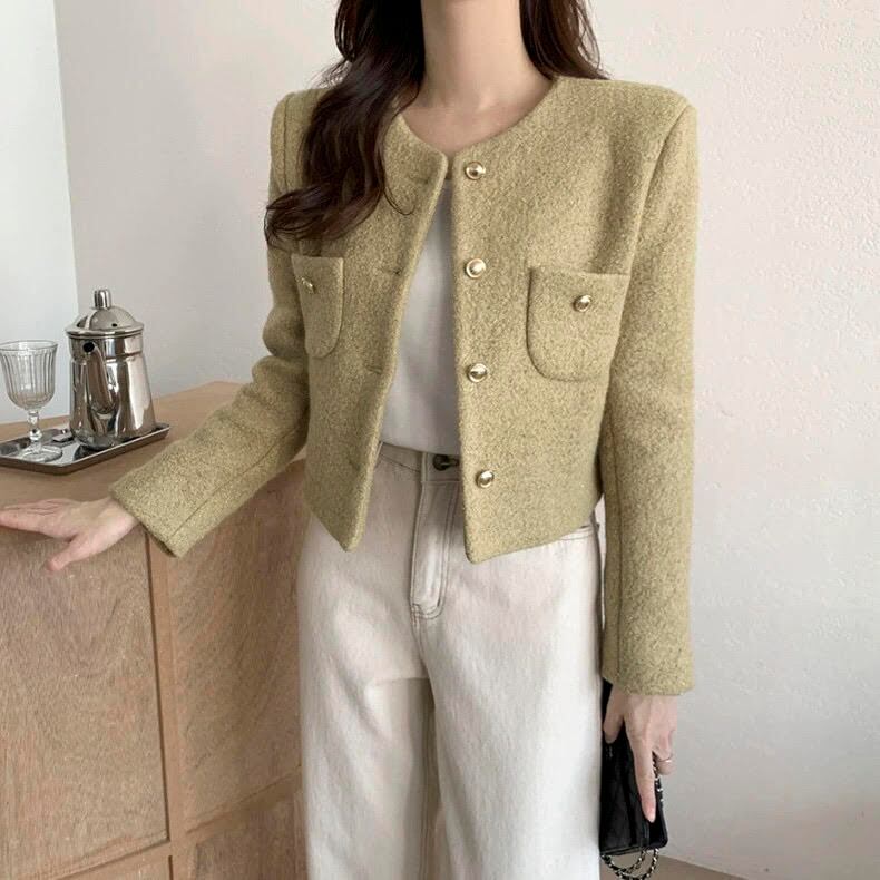 【送料無料】大人カラーショート丈ツイードジャケット ショート丈ツイードジャケット ツイード ジャケット ノーカラージャケット 緑 グリーン 青 ブルー ピンクカーキ オルチャン 韓国 レディース 高見えジャケット フロントボタン ゴールドボタン 金ボタン 前開き 胸ポケット ノーカラー 長袖ジャケット 長袖 きちんと 大人可愛い きれいめ 大人 上品 お洒落 オトナ女子 大人女子 デート きれいめカジュアル エレガント クール シック フェミニン レトロ インスタ映え 主役級 存在感 抜け感 こなれ感