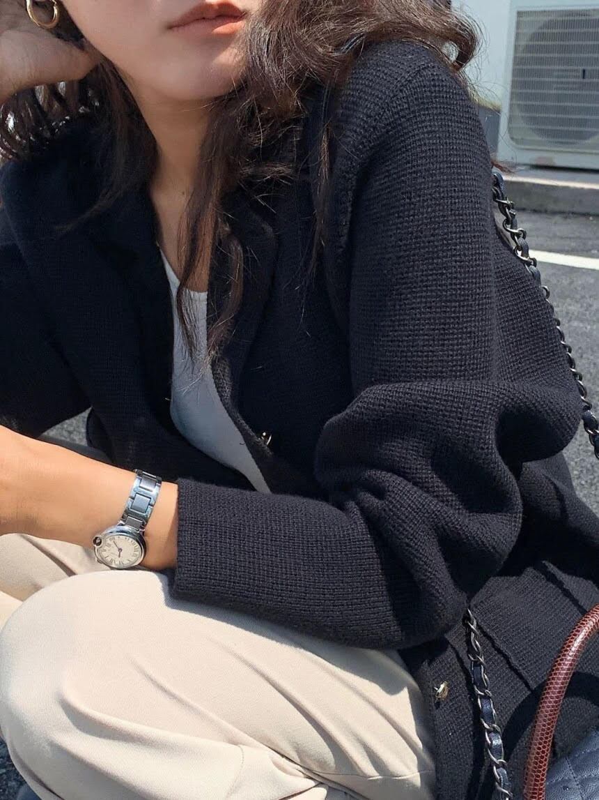 上品なゴールドボタンがアクセントとなり、シンプルながらも存在感を放つ一着です。
