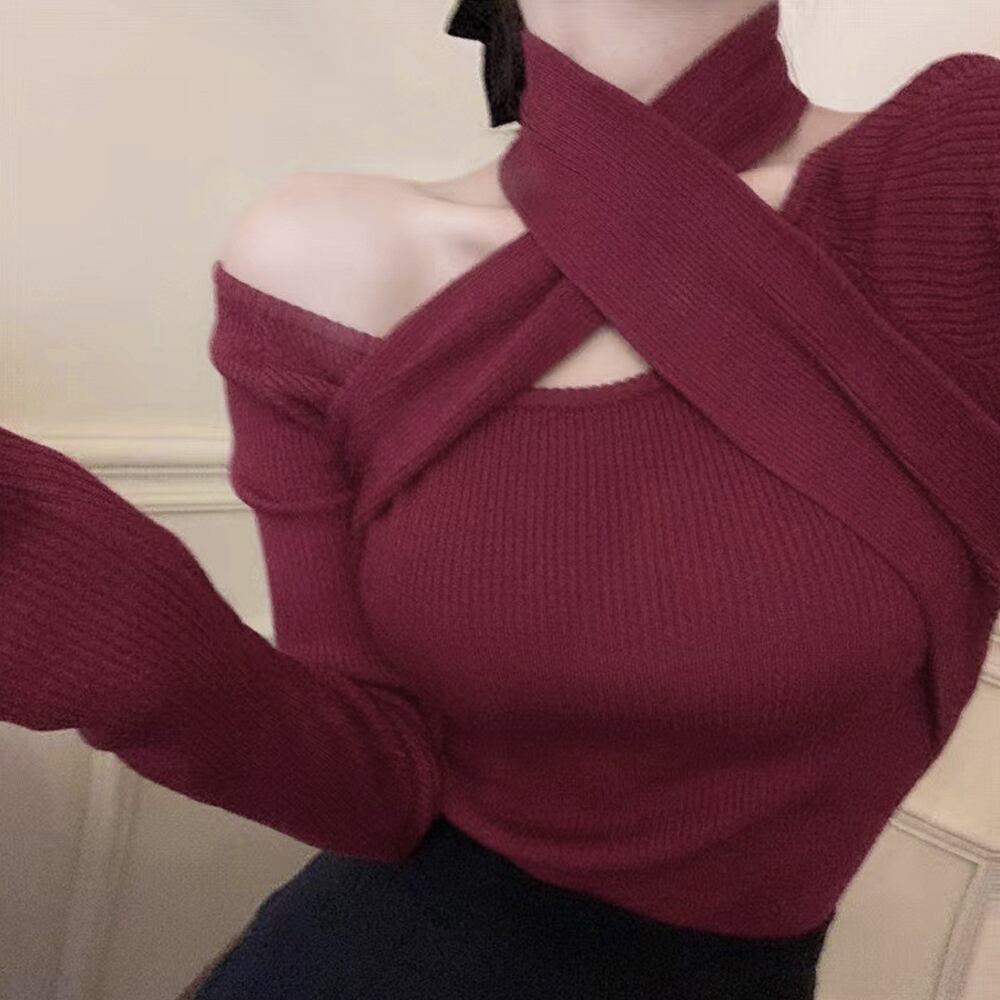 【即納】【送料無料】 腹だしトップス 腹だし ショート丈トップス へそ出し リブニット ホルターネック 肩出し セクシー ニットトップス 大人カジュアル 韓国ファッション 着やせ 春秋冬 鎖骨見せ 長袖 クロスネックニット ニットソー 肌見せ ニットセーター